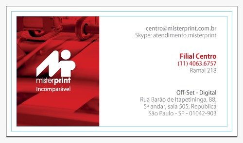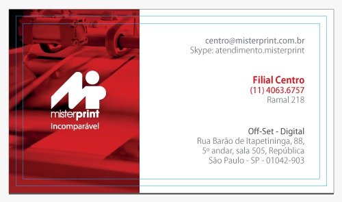 A Mister Print não garante fidelidade de cores em nenhuma hipótese. Os impressos poderão apresentar variação de intensidade e tonalidade das cores, em relação ao monitor ou à prova impressa, bem como em relação às reimpressões, ou seja, poderá ocorrer variação para mais claro ou escuro, mais amarelado ou avermelhado, mais azulado ou arroxeado e apresentar leve variação de tonalidade entre os cartões do mesmo lote. Havendo necessidade de controle densitométrico em seus impressos [todos sempre com a mesma aproximação de cor], consulte o custo deste processo com nosso departamento comercial.
