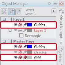 Caso você tenha costume de usar as ferramentas “Guides/Guias” ou “Guidelines/Linhas Guias” na construção da sua arte (CorelDraw), é importante verificar se nas “Layers/Camadas” em seu “Object Manager/Gerenciador de Objetos” estão com a opção de imprimir bloqueada, como no exemplo abaixo representado pelo ícone